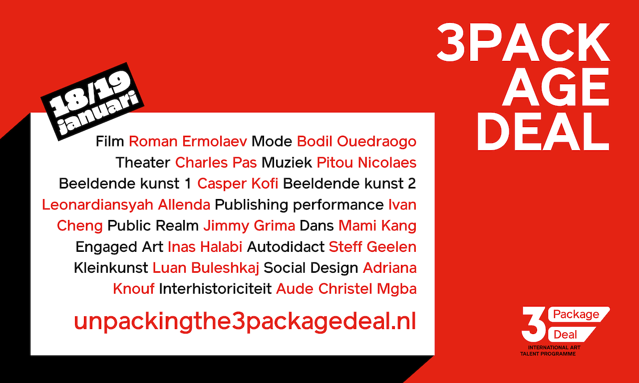 Wat de 3Package Deal kunstenaars verbindt is een buitengewoon talent en een focus binnen hun werk op actuele vraagstukken. Dit resulteert in onderzoek en kunstuitingen die zich richten op de urgente maatschappelijke vraagstukken voor nu, én in de toekomst. Zo richt de Maltese Jimmy Grima zich op de politiek van herinnering en archivering, waarbij hij vooral is geïnteresseerd in het verdwijnen van lokale en ongedocumenteerde kennis. En gebruikt de Japanse danseres Mami Kang vaak quasi-fictieve figuren om naar het idee van anders-zijn te kijken. Daarnaast probeert de Nederlandse fotograaf Casper Kofi via een modefotografie-aanpak om de jonge, mannelijke identiteit en het scala aan manieren waarop dit zichzelf kan tonen, te begrijpen en uit te drukken.