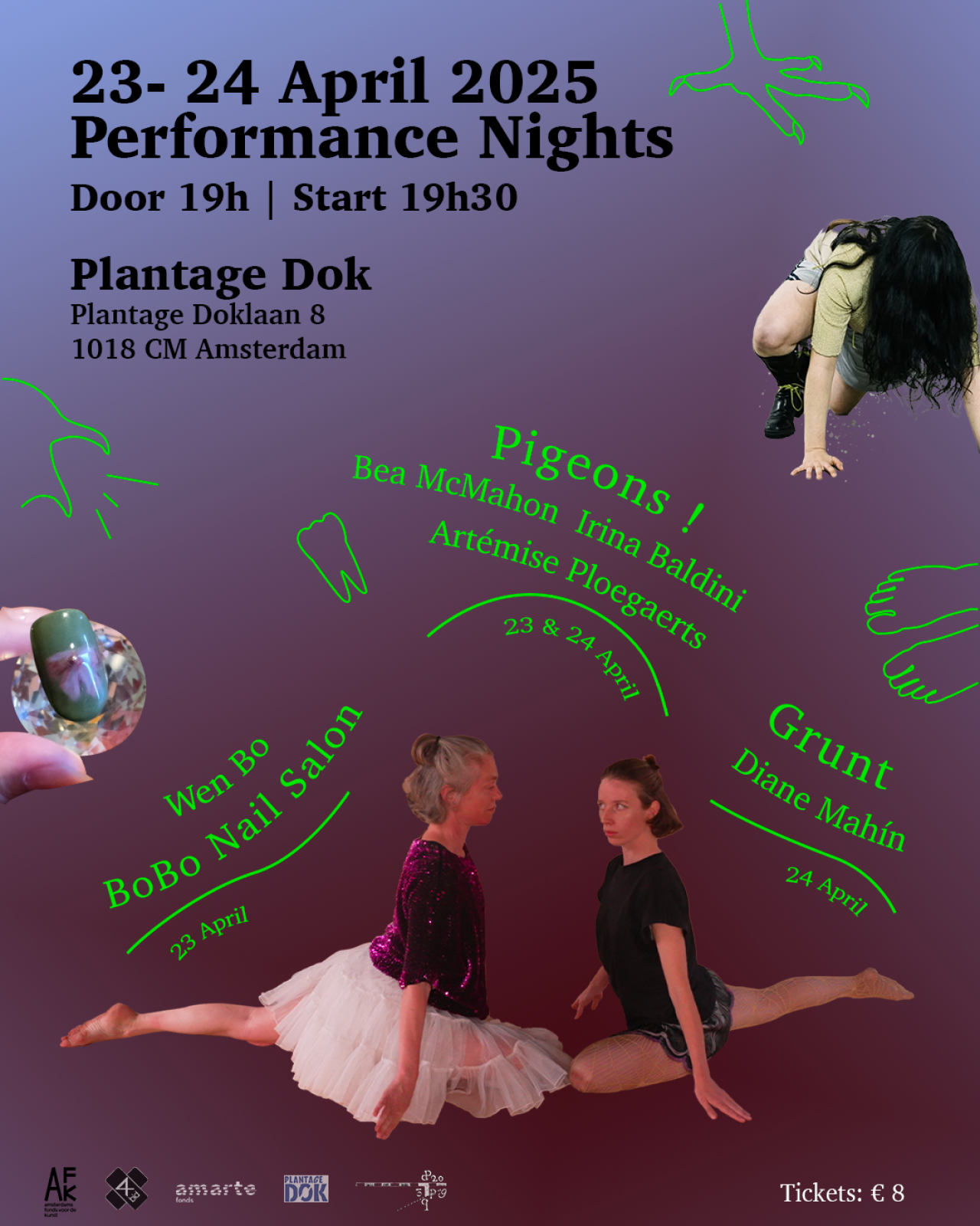 ‘Pigeons !’ is a performance project initiated by Artémise Ploegaerts and developed together with visual artist Bea McMahon, and dance artist and punk singer Irina Baldini. It combines choreography with vocals and text.